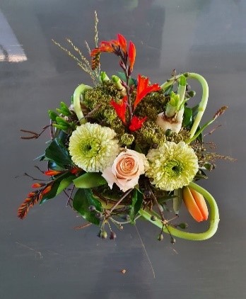 De materialen komen vers van de veiling, wat waarborgt dat het bloemstuk een standtijd heeft van 2 à 3 weken .