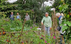 Martien vertelde ook, dat ieder jaar ooievaars op het nest in haar tuin terugkomen en over de jongen die aan het einde van het seizoen weer uitvliegen. Verder legde ze de werking uit van de windmolen, die voor bevloeiing van de tuin wordt gebruikt.