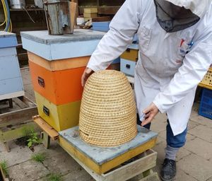 Hij heeft zo’n 6 bijenkasten en 1 korf. Vroeger werden alleen maar korven gebruikt. Deze waren van roggestro, echter de bijen maakten de raten vast aan het stro en het was heel moeilijk om deze daarvan los te snijden. In het voorjaar leven er ca. 15.000 tot 20.000 bijen in 1 kast. Dit aantal groeit snel uit, zodat er uiteindelijk in mei/juni zo’n 60.000 tot 80.000 bijen in 1 kast zitten. In een bijenkast bevindt zich slechts één koningin en wist u dat deze tot wel 1500 eitjes per dag kan leggen!